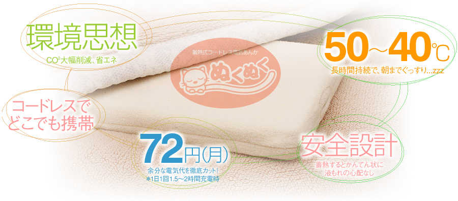 コードレスでどこでも携帯 72円(月) 余分な電気代を徹底カット!*1日1回1.5~2時間充電時 安全設計 蓄熱するとかんてん状に。液もれの心配なし 50~40℃ 長時間持続で、朝までぐっすり...zzz 環境思想 CO2大幅削減、省エネ